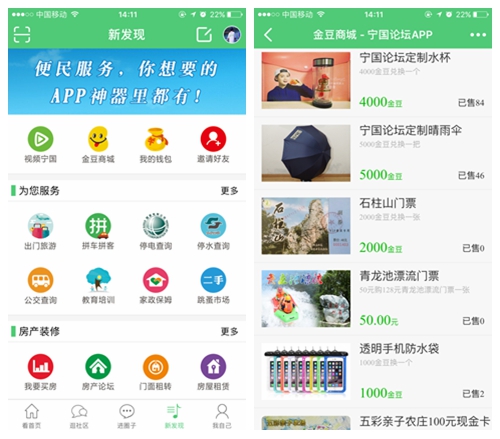 四、點擊底部“新發(fā)現(xiàn)”進入“金豆商城”,可用金豆兌換實物禮品