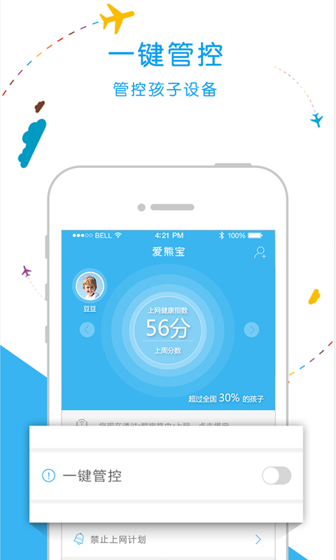【此為愛熊寶孩子端,安裝在孩子手機上,需在家長手機上安裝家長端,用家長端掃描孩子端綁定,即可為孩子制訂上網(wǎng)計劃。