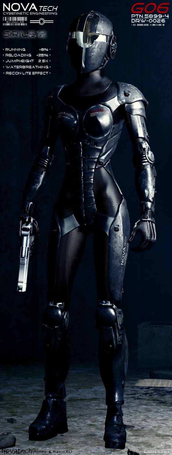 衣服:80防、50電抗、100能量抗、10火抗、50輻射抗。+敏捷/速度/力量/耐力/徒手傷害,抵消墜落傷害。頭盔:10防、5電抗、5能量抗、5火抗、10輻射抗。+感知/AP。水下呼吸。偵查鏡的功能。