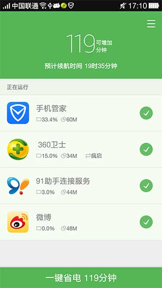 3、不同于通過關(guān)閉WIFI/藍(lán)牙等功能進(jìn)行省電的應(yīng)用,我們認(rèn)為wifi/藍(lán)牙并不是當(dāng)前手機(jī)耗電大戶,頻繁的開關(guān)WIFI/藍(lán)牙會(huì)降低用戶的手機(jī)使用體驗(yàn),以及可能增加耗電。