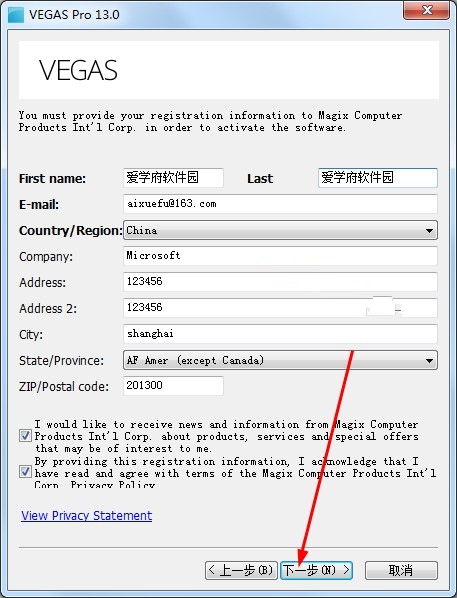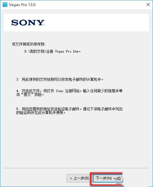 第二步:關(guān)閉提示窗口,注意注冊機(jī)暫時(shí)不要關(guān)閉,后面還要用到它,接著我們雙擊桌面的主程序快捷方式【Vegas Pro 13.0 (64-bit)】,在彈出的注冊界面中輸入:【1TR-8KY6-3ZPC-2X75】,點(diǎn)擊【下一步】按鈕。