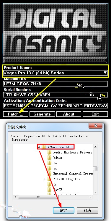 12.運(yùn)行后軟件會(huì)生產(chǎn)序列號,然后在注冊機(jī)上面點(diǎn)擊”Patch“。會(huì)彈出加載框,加載軟件安裝路徑下的Vegas Pro 13.0.例如小編路徑為C:\Program Files\Sony\Vegas Pro 13.0.如下圖