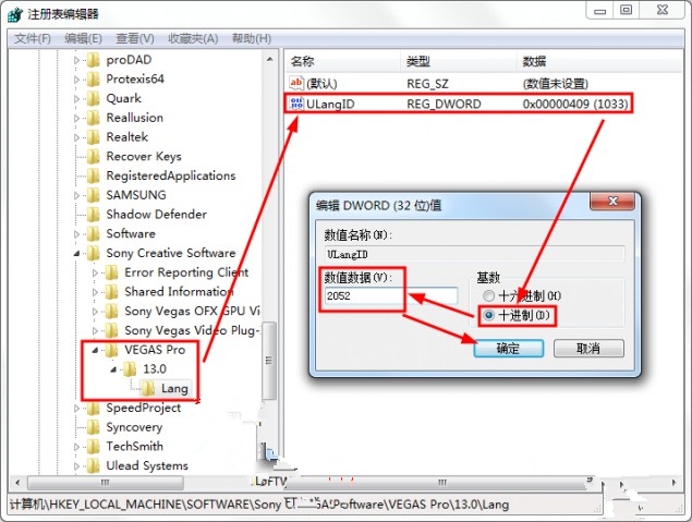 第九步:關(guān)于Sony Vegas Pro 13主程序中文語言開啟的說明:只需要修改語言代碼,依次打開【開始---運(yùn)行--輸入:regdit 】 回車打開注冊表定位到:HKEY_LOCAL_MACHINE\SOFTWARE\Sony Creative Software\Vegas Pro\13.0\Lang 中修改語言代碼為2052(十進(jìn)制),確定后重啟主程序即可。