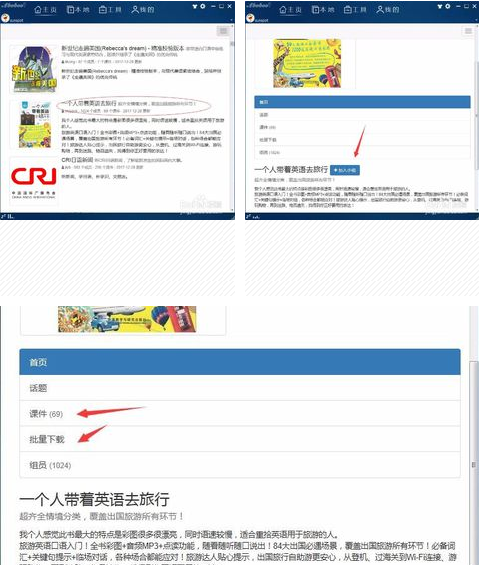 我們這里選擇《一個(gè)人帶著英語(yǔ)去旅行》這個(gè)課件,加入后就可以下載課件了,可以選擇批量下載和單個(gè)下載。
