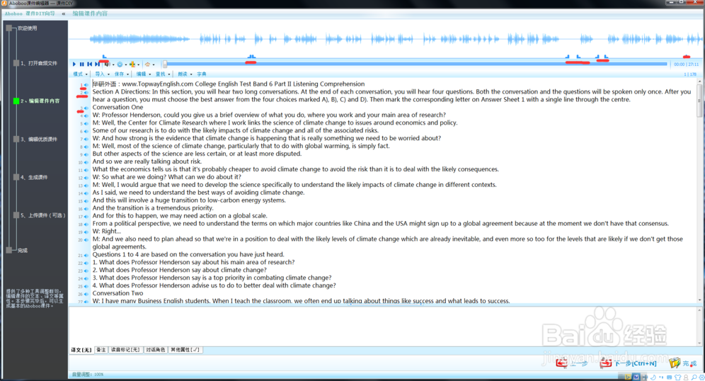 接下來(lái)就是第二步,編輯課件內(nèi)容,此步的主要工作就是合并整理句子(盡量做到一個(gè)句子一個(gè)編號(hào)),并觀察每個(gè)波形(音軌)編號(hào)是否與文本句子的編號(hào)一致。
