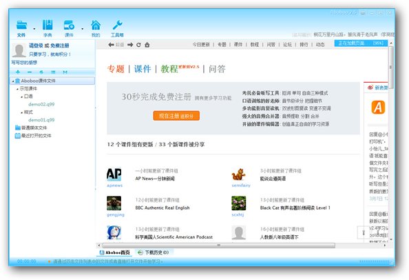 Aboboo正式版是一套免費(fèi)的外語(yǔ)輔助學(xué)習(xí)工具,功能非常強(qiáng)大,界面簡(jiǎn)潔明晰、操作方便快捷,設(shè)計(jì)得很人性化。針對(duì)發(fā)音、語(yǔ)調(diào)、流利度、音量精確評(píng)分,它可以幫助快速提高口語(yǔ)水平。Aboboo正式版內(nèi)含功能強(qiáng)大的影音學(xué)習(xí)工具,獨(dú)特的雙波形復(fù)讀操控,波形同步顯示,便于選取區(qū)間重點(diǎn)復(fù)讀。