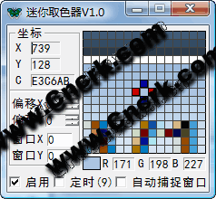 迷你取色器,為純綠色免費軟件,采用純Win32匯編編寫,體積小巧,使用方便。具有9倍放大、15x15網(wǎng)格分辨率、偏移取色、定時取色、自動捕捉窗口坐標(biāo)等功能。是網(wǎng)頁設(shè)計和編程設(shè)計人員必備的工具。