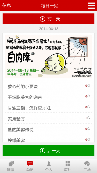1.可以新增家庭成員,并按成員篩選資訊。如主婦關系美容、婦科,兒子關注成長,丈夫關心職業(yè)病等。2.多數(shù)適合老年人閱讀的文章,都配有有聲朗讀功能。