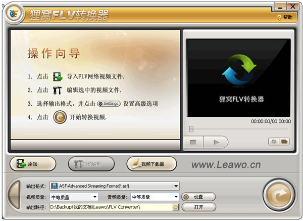 貍窩flv視頻轉(zhuǎn)換器是一款功能強(qiáng)大、界面友好的FLV音視頻轉(zhuǎn)換及編輯工具。集成視頻裁剪、拆分、合并及加水印功能,支持將FLV格式網(wǎng)絡(luò)視頻轉(zhuǎn)換為其他視頻格式。如轉(zhuǎn)換成:RM、RMVB、VOB、DAT、VCD、 DVD、SVCD、ASF、MOV、QT、MPEG、WMV、 MP4、3GP、DivX、XviD、AVI、等視頻文件,編輯轉(zhuǎn)換為手機(jī)、MP4機(jī)等移動設(shè)備支持的音視頻格式。有了貍窩flv轉(zhuǎn)換器,您可以把FLV格式的視頻轉(zhuǎn)換成所有的流行音視頻格式。