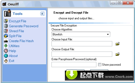Omziff V3.3.0.0 綠色漢化版 Omziff 是一款簡單的加密軟件,它能使用各種不同的加密算法來加密或者解密文件。包括: Blowfish, Cast128, Gost, IDEA, Misty1, AES/Rijndael, Twofish.等七種算法此外還有多種功能,如:隨機密碼生成器,文件粉碎機,文件切割機,哈希值計算器。