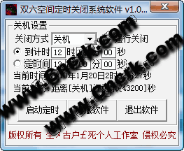 雙六空間定時關(guān)機軟件 V1.0 簡體中文綠色免費版 功能介紹:1.倒計時關(guān)閉系統(tǒng).2.定時關(guān)閉系統(tǒng).3.多方式選擇關(guān)閉方式.用于人離開電腦后,設定定時,以便節(jié)省不必要的耗電,本軟件可以選擇關(guān)閉方式,關(guān)機/重啟/注銷/休眠/冬眠/都可以強制執(zhí)行!
