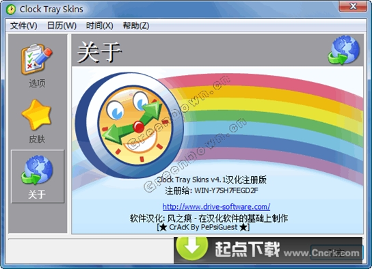 Clock Tray Skins V4.10 漢化綠色特別版 使用 Clock Tray Skins 可以替換你的標(biāo)準(zhǔn)的 Windows 操作系統(tǒng)托盤上的時(shí)鐘。可以使用不同的皮膚觀看日期和時(shí)間,可以設(shè)置年、月、日和時(shí)間的顯示方式。它還提供了日歷、整點(diǎn)報(bào)時(shí)、原子時(shí)鐘調(diào)校功能。注冊(cè)信息隨意填寫即可注冊(cè)成功!
