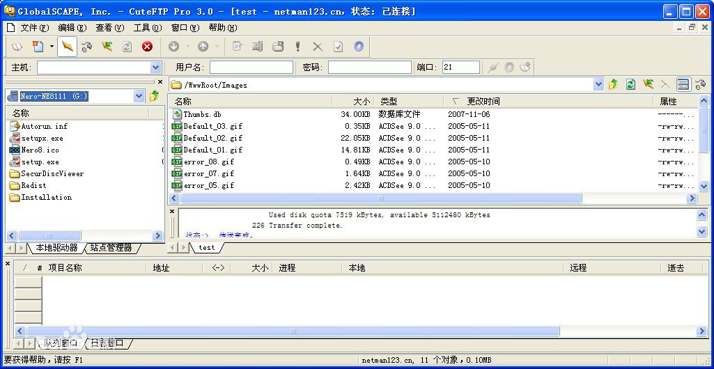 如果你要上傳文件,只需用鼠標(biāo)將“本地目錄”窗口中的文件拖曳到“服務(wù)器目錄列表”窗口中的相應(yīng)目錄即可,下載文件也是同樣的方法。另外,你還可以根據(jù)授權(quán)情況,在“服務(wù)器目錄列表”窗口中進(jìn)行建立目錄、刪除文件、文件重新命名等操作。