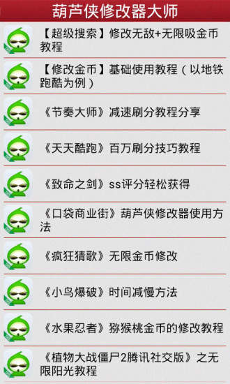 本應(yīng)用就針對(duì)市場(chǎng)上比較熱門的一些游戲如節(jié)奏大師,天天酷跑等為您詳細(xì)解析葫蘆俠的使用技巧。