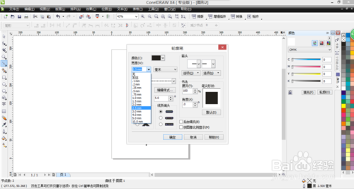 線太細(xì)效果不明顯。繼續(xù)打開(kāi)輪廓筆對(duì)話框,找到寬度一欄,線加寬,虛線效果就明顯了。