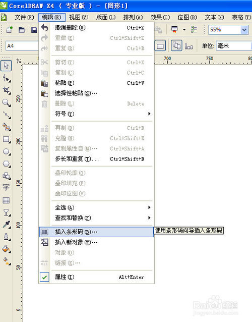 第一,頂部菜單欄,“編輯”--“插入條形碼”,如圖