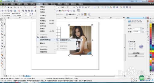 這個(gè)時(shí)候我們導(dǎo)入一張圖片,在【效果】菜單欄下,選中【圖框精確裁剪】中的【放在容器中】,然后在右邊的色條,右鍵點(diǎn)擊白色,把線框變成白色,然后【排列】下的【打散圖框精確裁剪曲線】從而打散圖框,接著就可以拖動(dòng)小正方形了,擺放一下小正方形,就能做出效果了。