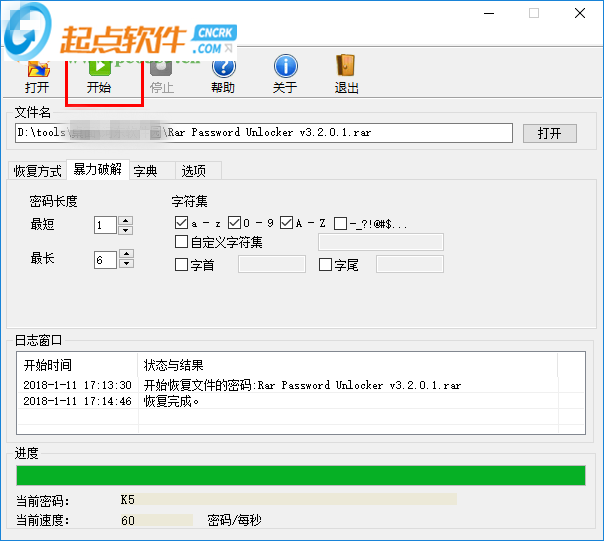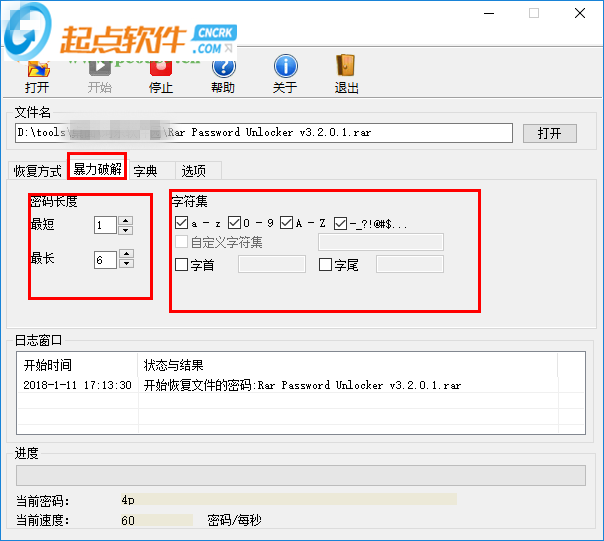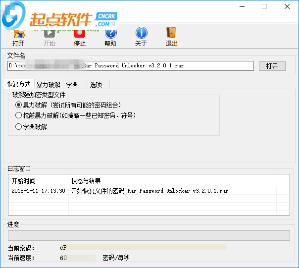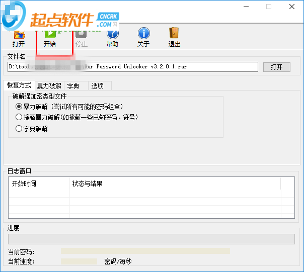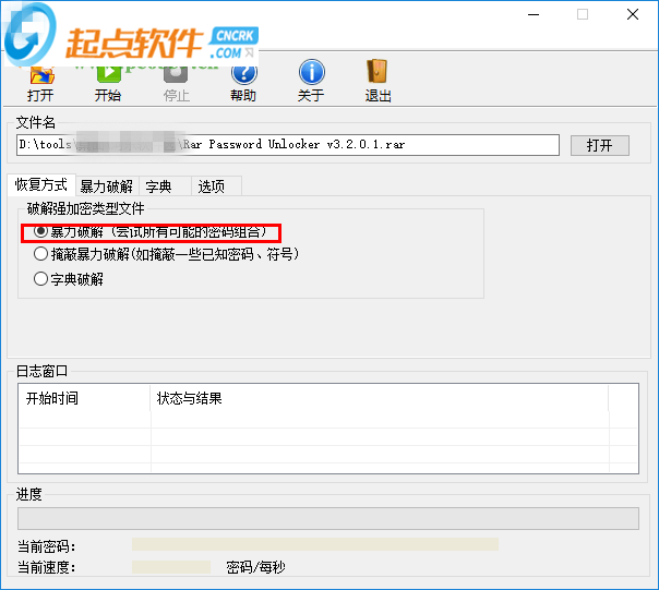 3、若用戶從網(wǎng)上下載的rar文件完全沒有密碼,可以直接在【恢復(fù)方式】一欄中勾選【暴力破解】,軟件將自動(dòng)嘗試所有密碼組合(速度可能會比較慢)。