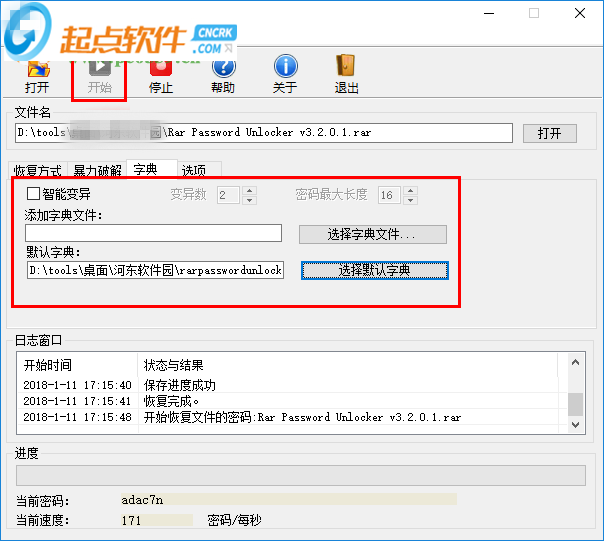 10、用戶在txt中輸入可能大概的密碼組合(每一行一列密碼),然后保存,在恢復(fù)方式中勾選【字典破解】后,點(diǎn)擊【字典】選項(xiàng)卡,然后添加字典,并設(shè)置能能能變異的變異數(shù)、密碼最大長度,點(diǎn)擊【開始】即可。
