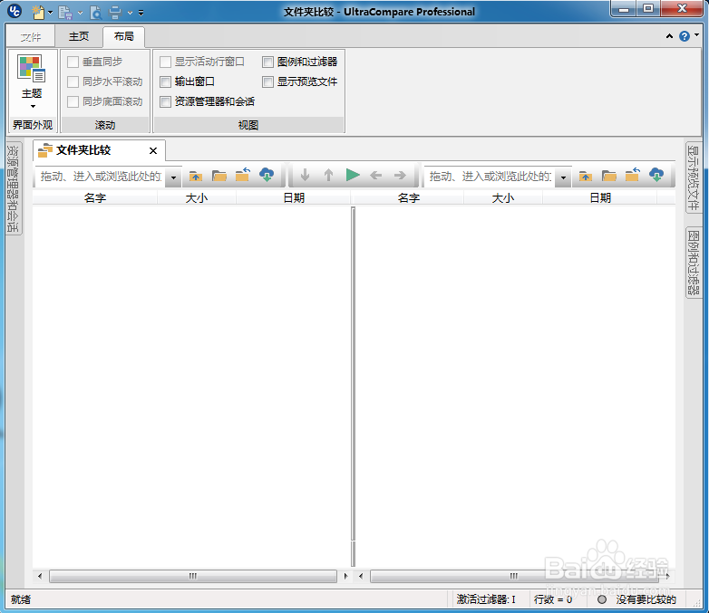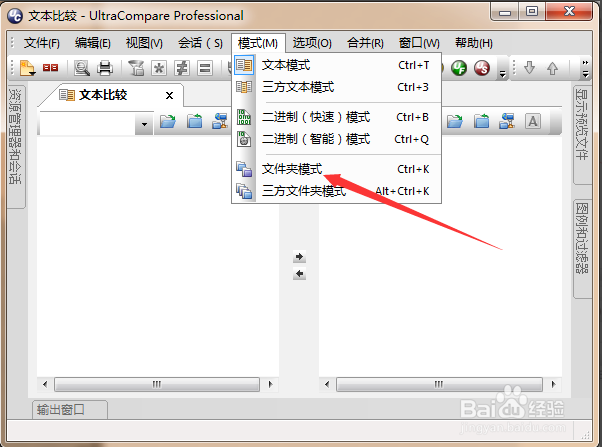 選擇模式->文件夾模式或者直接使用快捷鍵ctrl+k,進(jìn)入文件夾對(duì)比模式,如下圖。另外UltraCompare可以三個(gè)文件夾同時(shí)對(duì)比或者對(duì)單個(gè)文件對(duì)比,查看兩個(gè)或者三個(gè)文件差異的地方,但是注意現(xiàn)在對(duì)word等的支持不是特別好。注意一定要查看下是否進(jìn)入文件夾對(duì)比模式,如果不是文件夾對(duì)比模式?jīng)]辦法選擇文件夾只能選擇文件作為對(duì)比對(duì)象。
