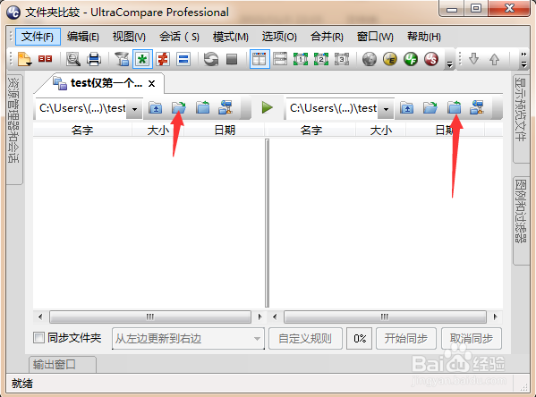 對(duì)比兩個(gè)文件夾時(shí),選擇兩個(gè)文件夾,左右兩邊需要都選定才行。下圖中箭頭指引選擇文件夾的方式。
