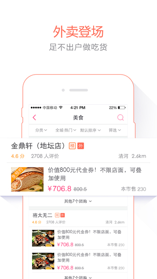 1.首頁團購,包含豐富多樣的團購商品,從美食到酒店,應(yīng)有盡有。2.附近團購,查看距離周邊的商戶及團購。