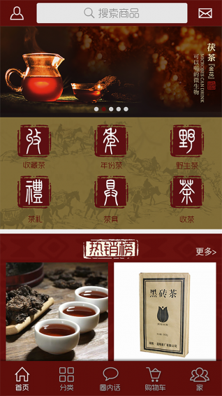 進入“陳茶會”首頁后,可以看到收藏茶、年份茶、野生茶、茶禮、茶具、收茶等六大品類和分類、圈內(nèi)話、購物車、家(個人中心)等四大板塊。其中,在茶品分類中有黑茶、白茶、普洱茶、茶具、茶禮等板塊,用戶只需點擊板塊標(biāo)簽,即可了解產(chǎn)品詳情。