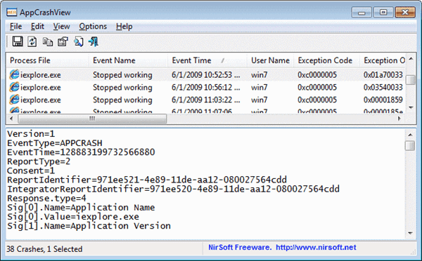 AppCrashView是一個(gè) Windows Vista 和Windows 7 中使用的小工具,可以顯示系統(tǒng)中程序崩潰的詳細(xì)信息。崩潰信息來自Windows Error Reporting (WER)組件自動(dòng)創(chuàng)建的.wer文件. AppCrashView 允許你簡(jiǎn)單地保存錯(cuò)誤列表成 text/csv/html/xml 文件.