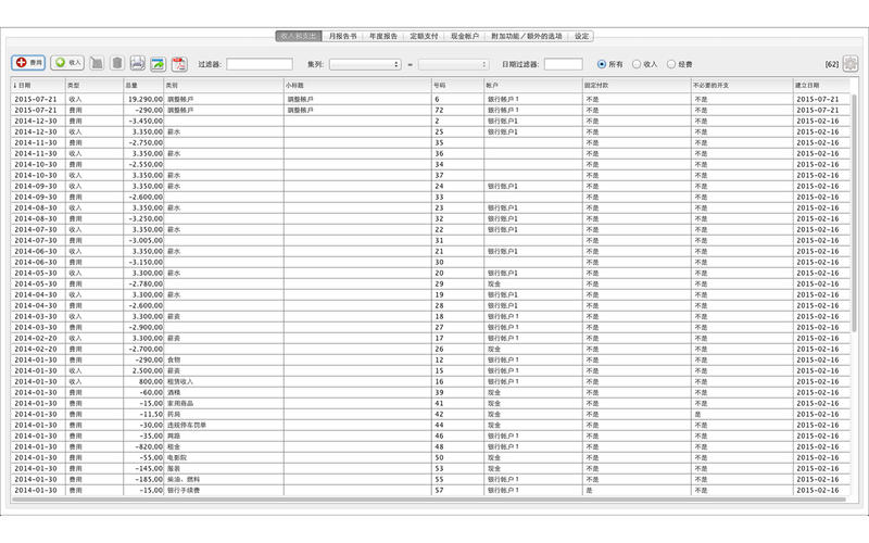 程序設(shè)有不同的過濾器,您可以用它們按不同透視視角來觀察自己的數(shù)據(jù)視圖。家庭開支、吃飯、停車票、保險(xiǎn)費(fèi)等許多其它項(xiàng)目都可以匯總和透視分析。同樣一些固定的、按月或年收取的支付項(xiàng)目也可添加。