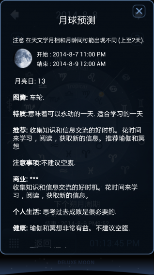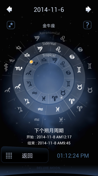 星座運(yùn)勢(shì),月相百科。一款華麗的月球狀態(tài)動(dòng)態(tài)顯示軟件。界面很漂亮,可以顯示每天月相圖、分時(shí)圖、遠(yuǎn)地點(diǎn)、近地點(diǎn)、月亮盈虧等,月相百科支持三種定位查看月相方式:基站定位、GPS、及手動(dòng)設(shè)置位置??梢圆榭慈我庖惶斓脑孪?。