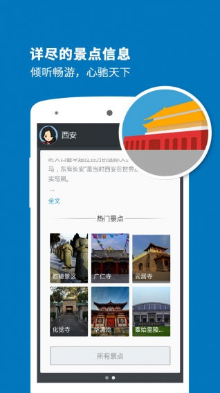 西安導(dǎo)游app:專業(yè)的智能語音導(dǎo)游系統(tǒng),專門為喜歡自由行的旅行愛好者而設(shè)計(jì)。西安導(dǎo)游app是將語音導(dǎo)游、門票信息、旅游攻略、景點(diǎn)美圖、旅游足跡等全面集中展現(xiàn)。我們的智能軟件像一個(gè)經(jīng)驗(yàn)豐富的導(dǎo)游,當(dāng)您進(jìn)入景區(qū)時(shí),及時(shí)地向您推薦您當(dāng)前的游覽線路及沿途景點(diǎn);當(dāng)您漫步在景區(qū)時(shí),西安導(dǎo)游能根據(jù)當(dāng)前您所處的景點(diǎn)位置,為您提供生動(dòng)的語音解說及詳盡的圖文介紹;當(dāng)您處在景區(qū)外時(shí),西安導(dǎo)游是一本妙趣橫生的百科全書,圖文并茂地向您展示著景區(qū)深邃的文化內(nèi)涵和豐富的歷史積淀,讓您體驗(yàn)到景區(qū)身臨其境的愉悅感。