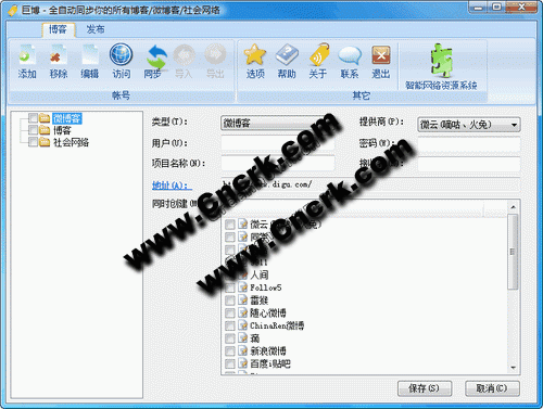 巨博是智能網(wǎng)絡(luò)資源系統(tǒng)的消息通知模塊的衍生產(chǎn)品。全自動(dòng)同步各種博客、微博客、社會(huì)網(wǎng)絡(luò)(SNS)等,支持MetaWeblog接口,Twitter/飯否/嘀咕/火兔/同學(xué)/做啥/9911/新浪微博/滔滔/QZone/ChinaRen/隨心微博/雷猴/滴/KaiXin001/i貼吧/51/搜狐/豆瓣/人人/若鄰/占座/人間/Follow5/原始村/海內(nèi)/你我他/Plurk等等。 特點(diǎn): 1.功能強(qiáng)大:支持市面上大部分博客、微博客; 2.完全綠色:不寫(xiě)注冊(cè)表,絕不捆綁任何軟件/插件,不用安裝,只有一個(gè)文件; 3.隨時(shí)隨地:在不同的電腦之間自動(dòng)同步你的帳號(hào)信息; 4.支持驗(yàn)證:支持各種形式的登錄/認(rèn)證碼校驗(yàn)