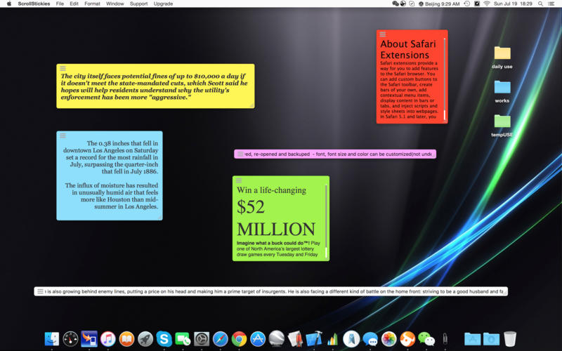ScrollStickies Mac版是一款 Mac OS X 上的便簽應(yīng)用,ScrollStickies與以往的便簽不一樣的地方是,當(dāng)遇到長(zhǎng)內(nèi)容的時(shí)候,它會(huì)可以讓你進(jìn)行滾動(dòng)操作,即不用改變便簽框的大小也可以瀏覽全部便簽內(nèi)容。【軟件特點(diǎn)】