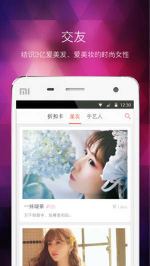 〔折 扣 卡〕不用辦卡,借用星友會員折扣卡,享受比河貍家、糯米網(wǎng)、美團團購更低價格,省去空空狐,轉(zhuǎn)轉(zhuǎn)、58、趕集淘卡辛苦。〔同城交友〕結(jié)交志趣相投的美甲、發(fā)型朋友、,樂趣拼多多,約上一起去美啦