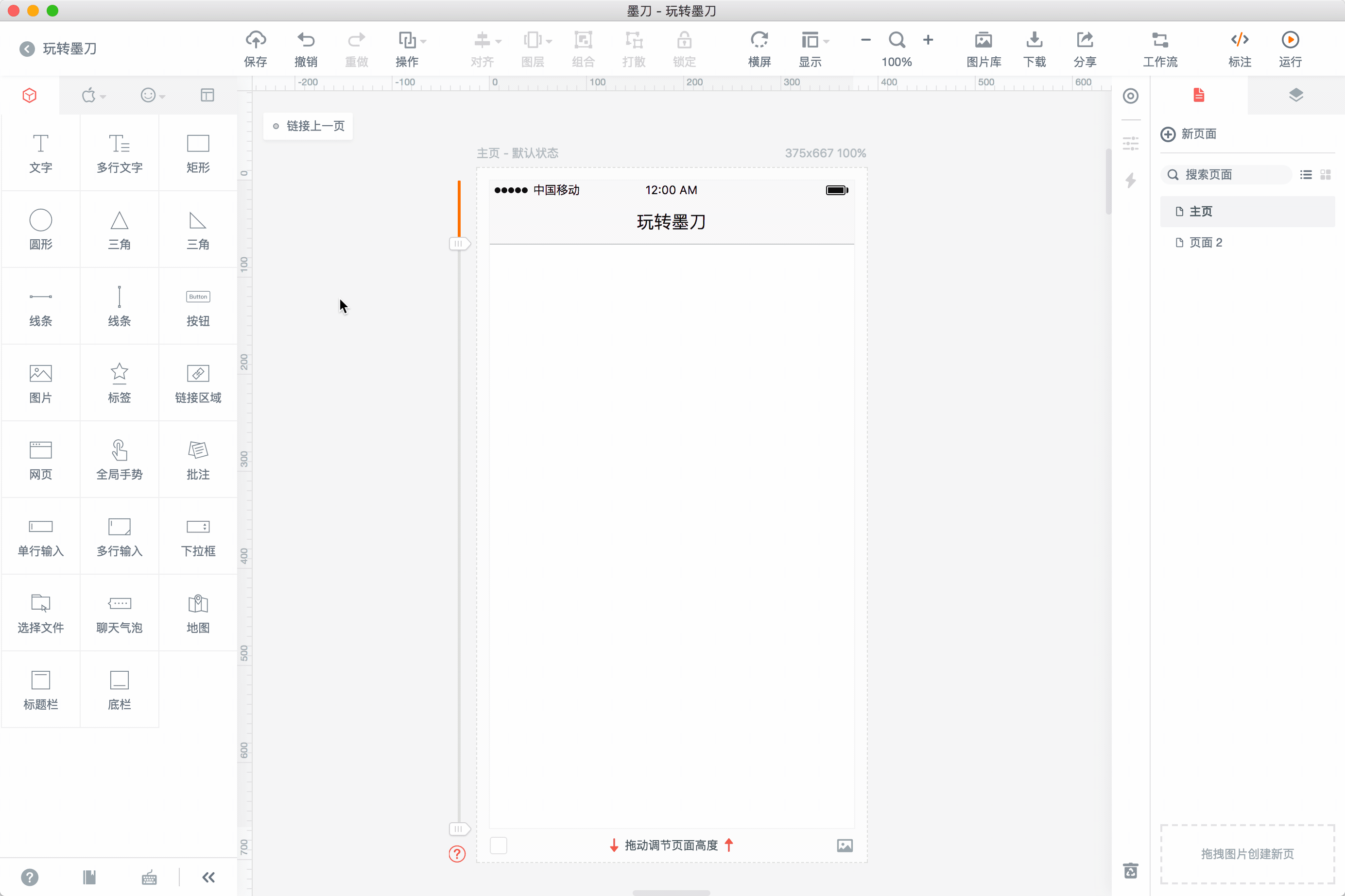 墨刀創(chuàng)建頁(yè)面內(nèi)容非常的簡(jiǎn)單:從左側(cè)控件區(qū)拖拽控件到頁(yè)面設(shè)計(jì)區(qū),然后在屬性設(shè)置面板和頂部工具欄中編輯其細(xì)節(jié)就可以了。