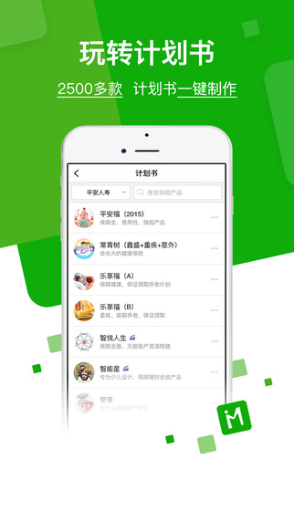 1、在線智能計(jì)劃書2600多款保險(xiǎn)產(chǎn)品,200多款熱銷保險(xiǎn)產(chǎn)品計(jì)劃,全面覆蓋各大保險(xiǎn)公司產(chǎn)品,讓你輕松做出客戶滿意的保險(xiǎn)計(jì)劃書,還添加官方解讀、紅利演示、酷炫彩頁,更有保險(xiǎn)開門紅專題助力移動(dòng)展業(yè)。