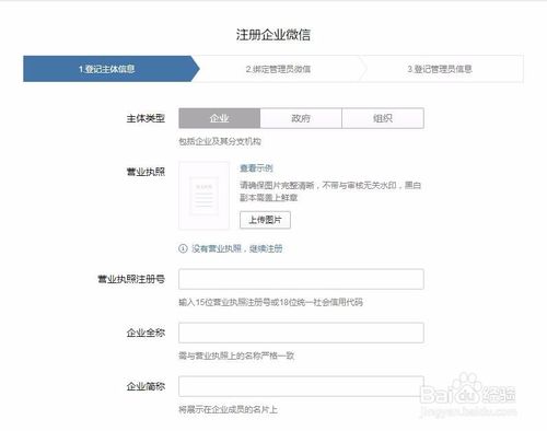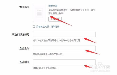 3、上傳營業(yè)照片,填寫營業(yè)執(zhí)照注冊號、企業(yè)全稱、企業(yè)簡稱(將展示在企業(yè)成員的名片上)