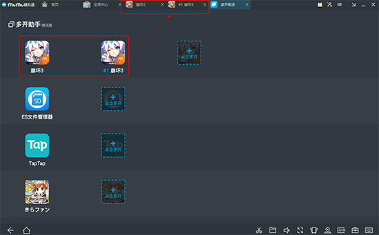 2、在多開(kāi)助手界面,選擇您要多開(kāi)的應(yīng)用或游戲,選項(xiàng)后,會(huì)在軟件頂部有你多開(kāi)的軟件。