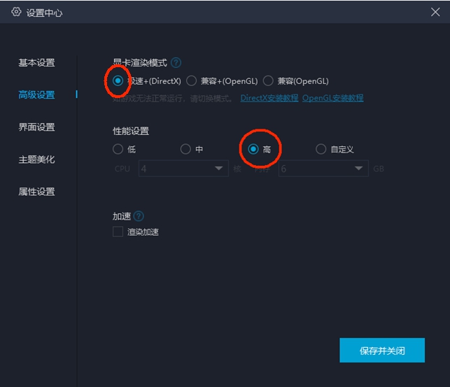 第一步,檢查模擬器“設(shè)置中心”-“高級(jí)設(shè)置”,將把顯卡渲染模式設(shè)置為【極速+】或【兼容+】,性能設(shè)置為“CPU≥2 內(nèi)存≥2”,重新啟動(dòng)游戲即可。