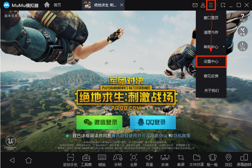 1、點(diǎn)擊網(wǎng)易MuMu模擬器桌面快捷方式,打開(kāi)軟件后,點(diǎn)擊右上方的三個(gè)橫杠圖標(biāo),然后在彈出的選項(xiàng)中點(diǎn)擊“設(shè)置中心”。