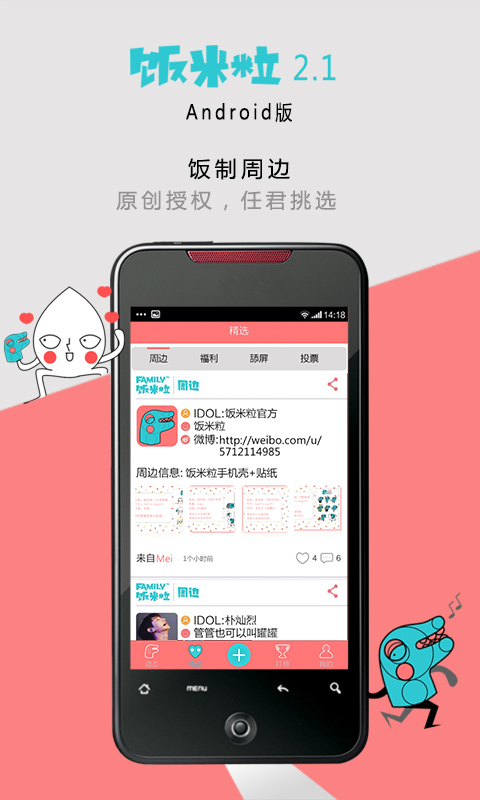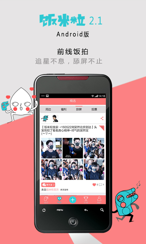 專屬飯拍:海量一手內容,直擊明星機場,明星見面會、影視歌作品發(fā)布會、演唱會、頒獎典禮、綜藝節(jié)目錄制等活動現場,精彩采訪報道。追星不息,舔屏不止!飯制周邊:愛豆Q版玩偶、日程本、人形立牌、寫真DVD、鑰匙圈、手機支架等等,上百位飯圈大神授權的原創(chuàng)愛豆周邊任君挑選,讓粉絲的愛熊熊燃燒!