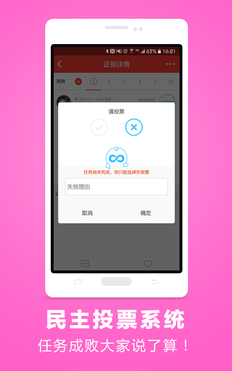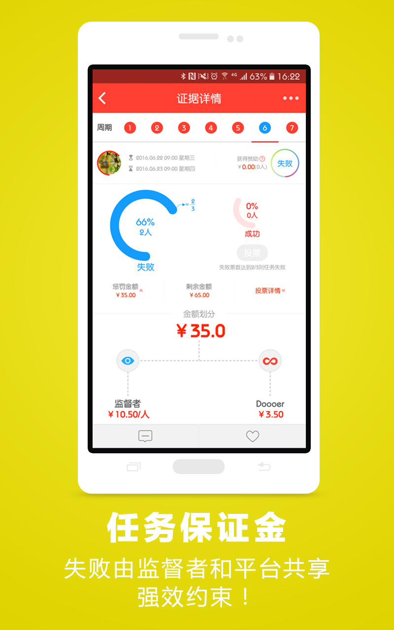 任務(wù)開始后通過提交證據(jù)來證明自己或者他人任務(wù)成功還是失敗,根據(jù)證據(jù)由監(jiān)督者投票決定最后結(jié)果。成功則保證金全額返回,失敗則保證金將按規(guī)則劃分給監(jiān)督者和Doooer平臺。