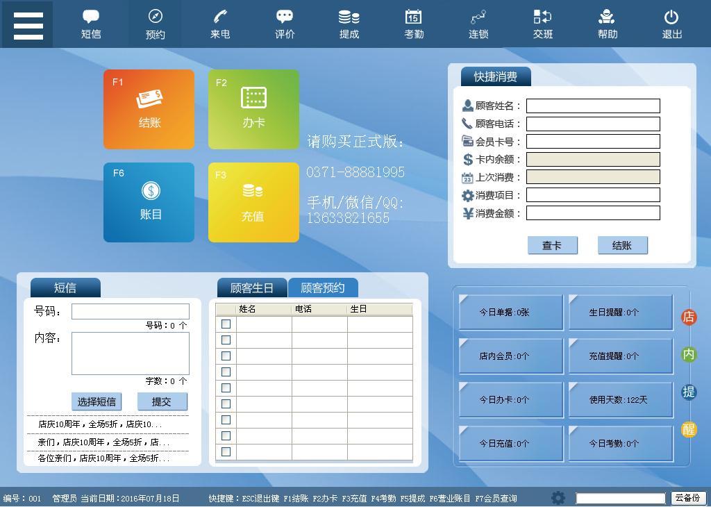 軟件分為會員管理、商品和服務管理、員工管理、營業(yè)賬目管理四大模塊,另有短信群發(fā),日常提醒功能。軟件易學易懂,簡單實用,不懂電腦的人也可以自由操作。