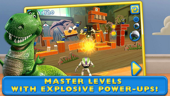 和所有的拋射砸毀游戲一樣,這一作中的積木建筑也有特定突破點(diǎn),開始的兩三關(guān)中系統(tǒng)會(huì)教你怎樣找突破點(diǎn),按左右方向鍵移動(dòng)巴斯光年,可以調(diào)整主視角的角度,變換方向來砸球。擊中木塊讓堆疊的木塊塔倒下,上面站著的外星人就會(huì)自動(dòng)逃走,同時(shí)如果用球砸中金黃色方塊或者倒塌的時(shí)候碰到方塊,就能得到額外加分。注意這里球只能砸往積木或者玻璃方塊,直接瞄準(zhǔn)外星人的話,它們會(huì)舉起盾牌防御,基本是打不下來的。盡管如此,我們也還是有很多辦法把這些綠色的小東西砸下來,除了找到合適角度和一個(gè)突破點(diǎn)之外,巴斯光年的旋風(fēng)彈也非常有用,旋風(fēng)彈的作用是貫通,對(duì)準(zhǔn)目標(biāo)砸出去后,點(diǎn)擊黃色的按鈕就會(huì)旋轉(zhuǎn),擊中目標(biāo)會(huì)繼續(xù)向前飛。因?yàn)楸咀髦袥]有商城什么的,最好用的道具就是普通球和旋風(fēng)彈,所以游戲的益智核心就很突出了。