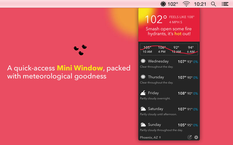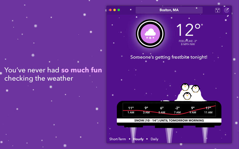 每當(dāng)CARROTWeatherformac檢測(cè)到你所在地區(qū)的降水或嚴(yán)重的天氣警報(bào)時(shí),她都會(huì)通知你。如果你有自己的CARROTWeather的iOS客戶(hù)端,她甚至可以提出通知發(fā)送到您的移動(dòng)設(shè)備。CARROTWeatherformac的小窗口位于菜單欄,讓您查看短期,小時(shí),和一個(gè)快速單擊或按鍵日?qǐng)?bào)預(yù)報(bào)。你甚至可以從菜單欄中分離迷你窗口,并將它保存在你的其他應(yīng)用程序的前面。