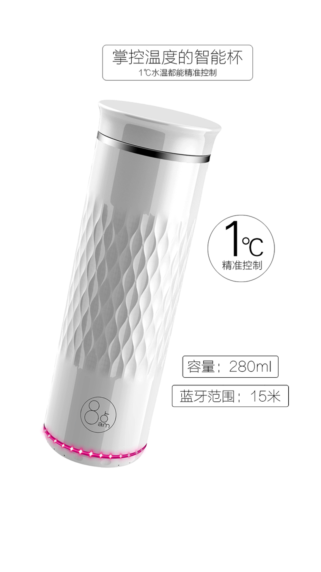 8點智能恒溫水杯,一款真正意義上的智能控溫水杯:1、恒定健康水溫:通過藍牙4.0連接手機APP,可根據(jù)每個人的體質(zhì)定制理想的溫度,永久恒定在此溫度上。