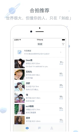 如故app是一款為你尋找soulmate的手機(jī)應(yīng)用。如故app通過眾多社會心理學(xué)家研究打造的K-TES測試、最優(yōu)匹配算法、以及更多有趣的題目能讓用戶進(jìn)行更深層次的精神交流,找到和自己三觀契合,品味相近的朋友。你一個(gè)人吃飯旅行,到處走走停停,也一個(gè)人看書寫信,自己對話談心。