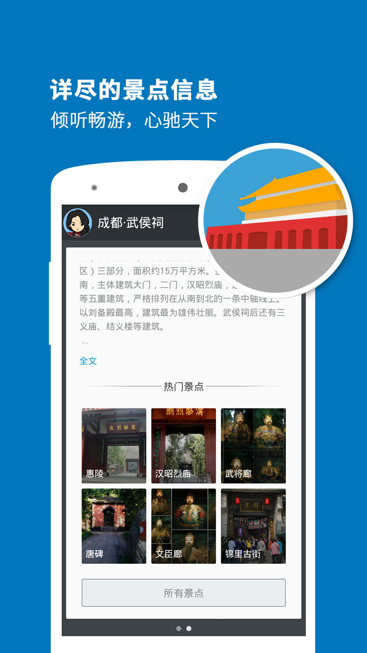 聽游天下——武侯祠導(dǎo)游:專業(yè)的智能語音導(dǎo)游系統(tǒng),專為喜歡自由行的旅行愛好者而設(shè)計。攜手科大訊飛,帶給您獨特的成都武侯祠印象。