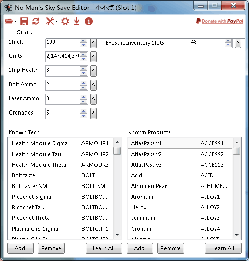 這里有很多的英文,看不懂沒關(guān)系,總之,上面呢,是一些金錢啊,護盾啊,生命值啊亂七八糟的,下面這部分呢,左半是技術(shù)圖紙,右半是產(chǎn)品配方,你們可以點下面的:Learn All,就是學(xué)習(xí)所有的意思。