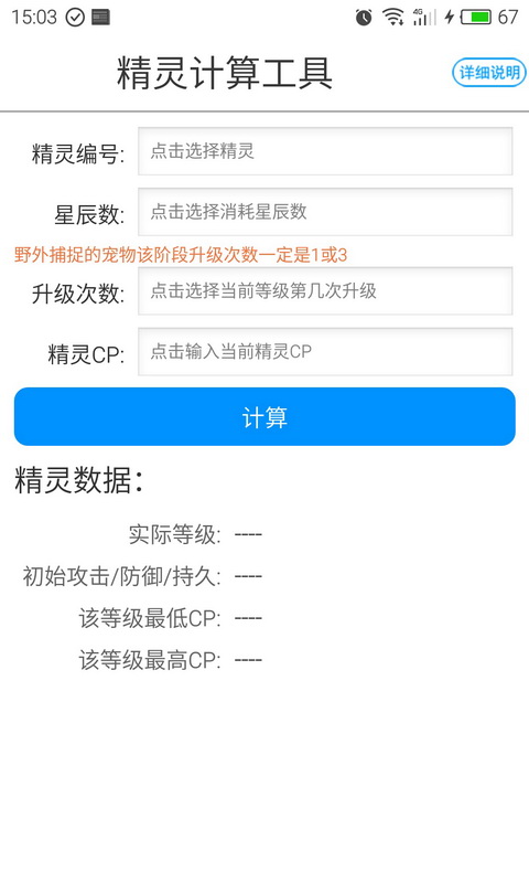 寶可夢(mèng)屬性計(jì)算器是一款游戲輔助類(lèi)的軟件,通過(guò)寶可夢(mèng)屬性計(jì)算器你可以更多的了解哪個(gè)寵物小精靈是值得培養(yǎng)的,對(duì)于寶可夢(mèng)的玩家來(lái)說(shuō)非常的不錯(cuò)。寶可夢(mèng)屬性計(jì)算器是一款非常實(shí)用的寵物小精靈屬性計(jì)算器。很多人都在糾結(jié),Pokemongo上抓到精靈到底是否值得培養(yǎng),有了這款計(jì)算器,你可以不用糾結(jié)來(lái),只要輸入幾個(gè)數(shù)值,輕輕一點(diǎn)就能幫你了解你精靈的潛力,讓你擺脫選擇困難的煩惱!玩家不能在抓到精靈后看到CP環(huán)越滿(mǎn)就覺(jué)得這個(gè)精靈越好,這是因?yàn)槊總€(gè)精靈的成長(zhǎng)空間是不同的,CP環(huán)越滿(mǎn)的只是表示這個(gè)精靈升級(jí)到滿(mǎn)級(jí)消耗的星辰總數(shù)越少,每個(gè)精靈升級(jí)到滿(mǎn)級(jí)屬性是不相同的。下面將詳細(xì)的告訴大家怎么使用這款計(jì)算工具:首先在精靈編號(hào)中選擇好需要判斷的精靈種類(lèi);接著將目前升級(jí)該精靈需要消耗的星辰數(shù)填寫(xiě)在星辰數(shù)一欄中;然后確定該精靈目前的升級(jí)次數(shù),這里重點(diǎn)說(shuō)下升級(jí)次數(shù)的確定,剛抓到的精靈升級(jí)次數(shù)一定是1或3,所以需要通過(guò)升級(jí)2次后來(lái)判斷升級(jí)次數(shù)是幾,如果升級(jí)2次后星辰數(shù)變化了那么現(xiàn)在的升級(jí)次數(shù)是1,若升級(jí)2次后星辰數(shù)沒(méi)有變化那么現(xiàn)在的升級(jí)次數(shù)則是3;填上該精靈目前的CP值后點(diǎn)計(jì)算。